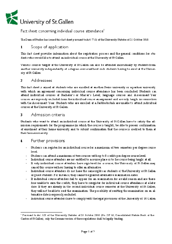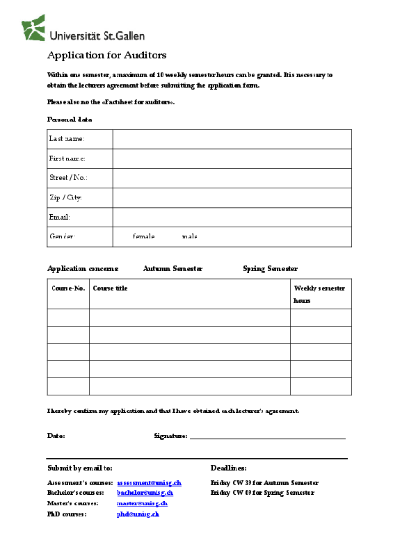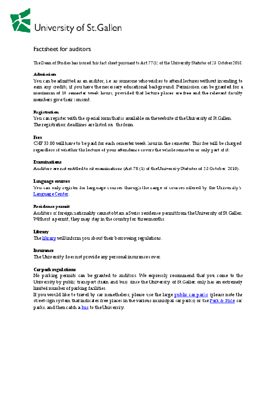 You may take part in lectures at the HSG as a guest auditor if you fulfil the required qualification. Auditors shall not sit examinations. For more information about admissions and fees, please contact the Dean's Advisory Office.