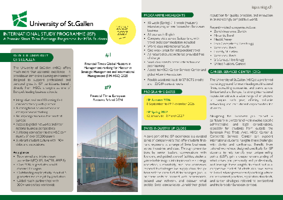 The International Study Programme (ISP) is a 10- to 11-week, short term exchange designed for ambitious MBA students from partner universities around the world. Held at the University of St.Gallen (HSG) — one of Europe’s top business schools and located in the heart of Switzerland — the ISP offers students a unique opportunity to deepen their understanding of European business in a rapidly evolving global context.