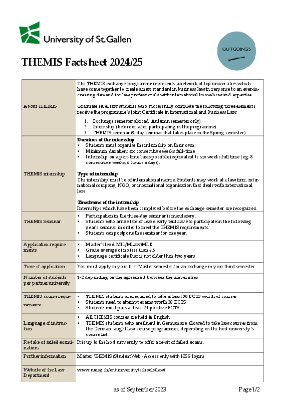 The THEMIS programme is for MIL, MLaw and MLE HSG students only. Graduate level law students from the HSG will be able to go on exchange in autumn term at one of the partner universities within the network, attend a specialised 3-days THEMIS seminar in spring term and participate in an international internship (organised by the students her/himself). Students who are selected to participate in the THEMIS programme will obtain not only their local law degree but also the International THEMIS Certificate.