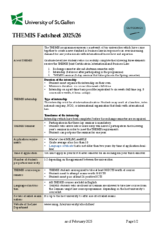 A minimum of 24 transferable and THEMIS accredited ECTS course credits must be completed with a positive grade at the host university, otherwise no credits from the exchange term will be transferred towards the HSG degree.