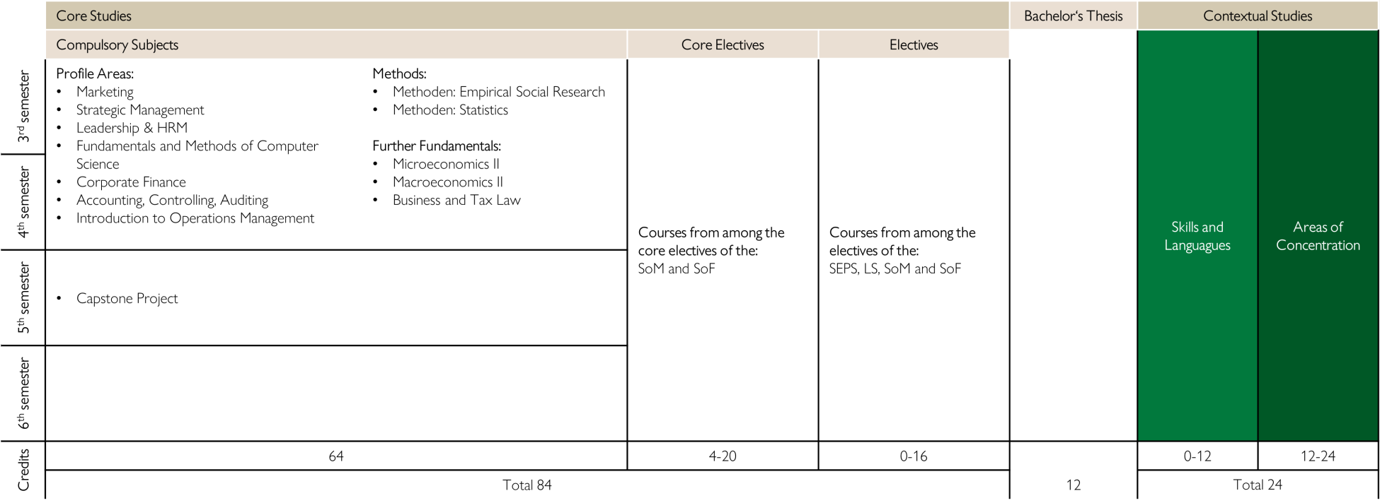 The compulsory area covers 13 courses (contact study and self-study), which must be completed by all students in the Major in Business Administration. Most courses are offered alternately in German and English once per semester.