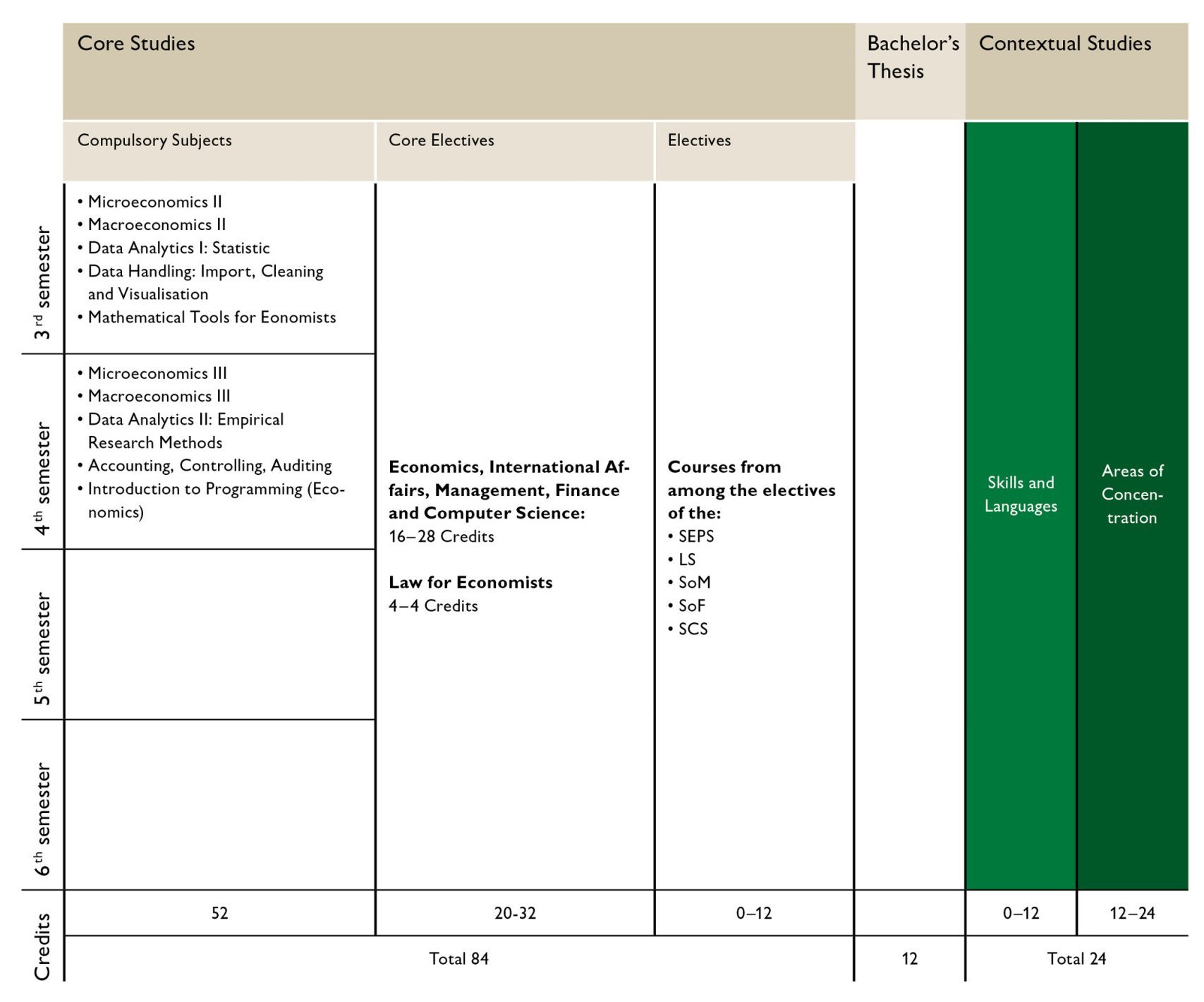 The curriculum of the Major Economics consists of three components: the Core studies (84 ECTS credits), the Contextual studies (24 ECTS credits). Completed is the degree with the Bachelor’s Thesis, including the Thesis Preparation Colloquium (12 ECTS credits). While the Core studies focus on developing students' expertise in economics, the Contextual studies are designed to enhance their social and cultural competencies.
