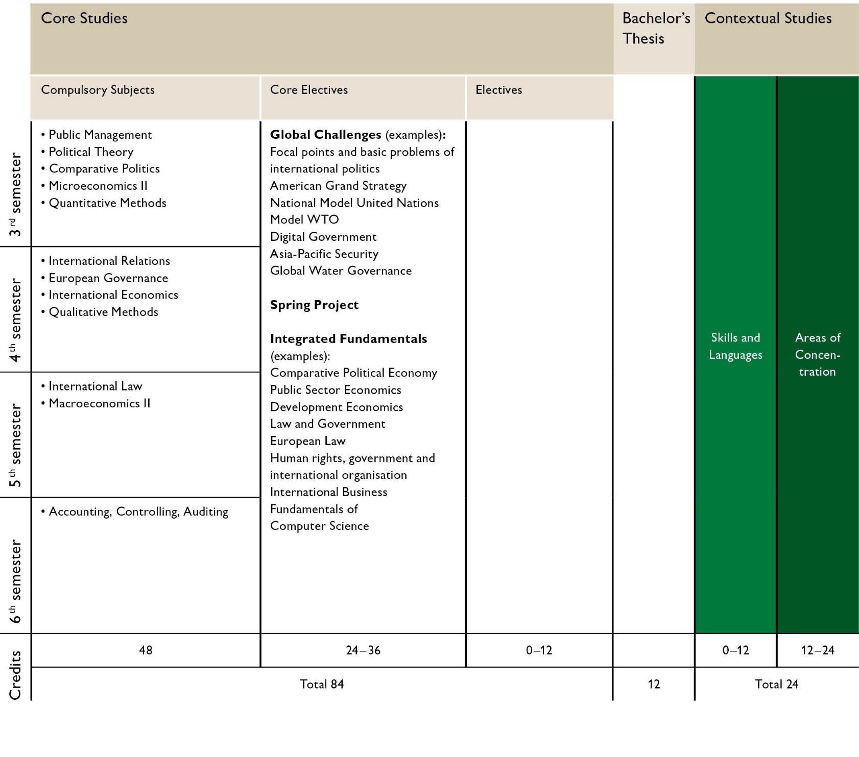 The curriculum of the Major International Affairs consists of three parts: the core studies (84 ECTS credits), the contextual studies (24 ECTS credits) and the Bachelor's Thesis (12 ECTS credits). While the core studies involves professional competences in economics, the contextual studies focus on the development of social and cultural competences.