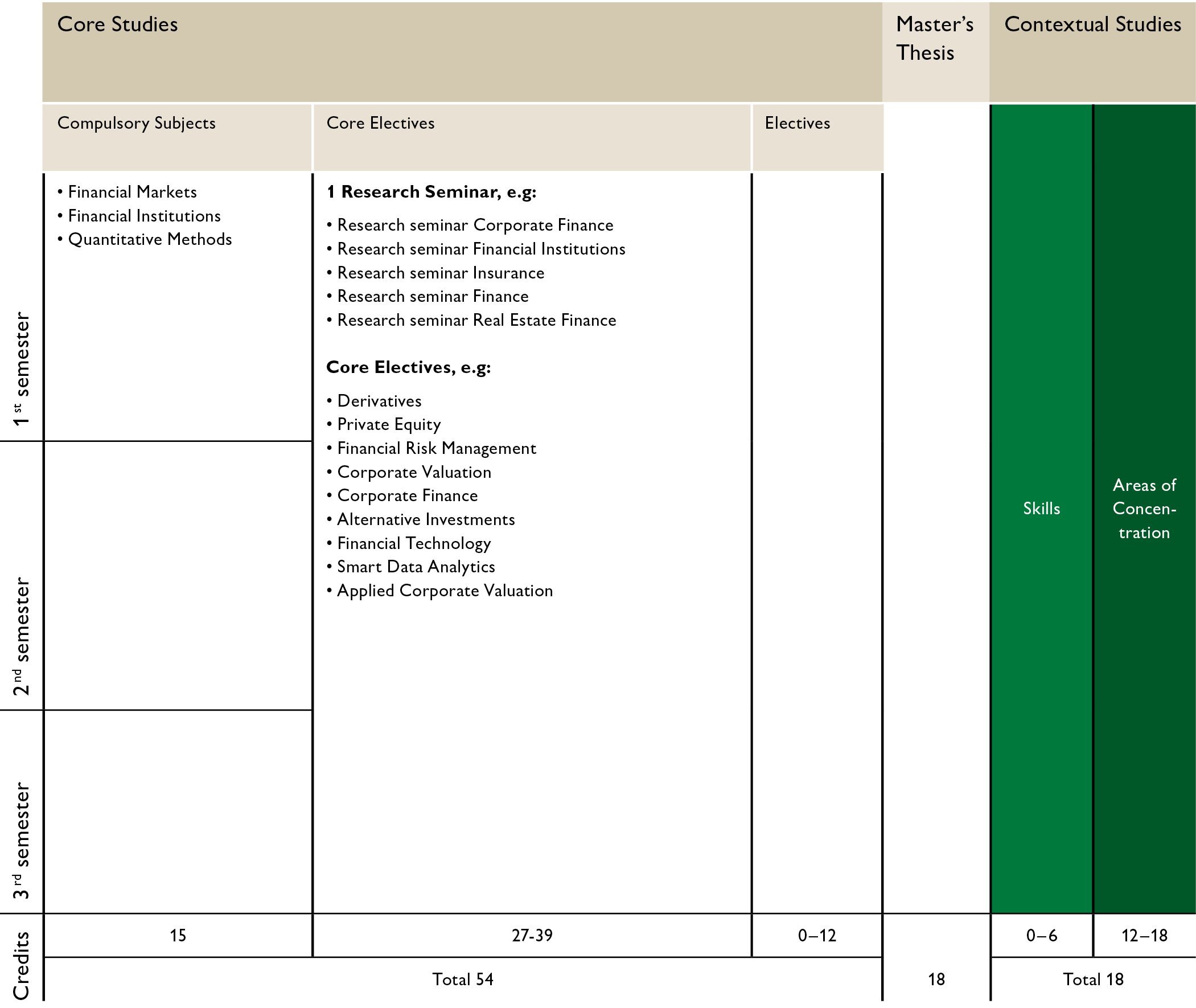The MBF programme is structured in such a way as to ensure that students are able to acquire their basic knowledge in the compulsory courses of the first semester. In the second and third semesters, students select core electives and contextual courses according to their individual preferences and thus determine the orientation of their studies themselves. Like this, the MBF curriculum guarantees utmost flexibility and freedom of choice.