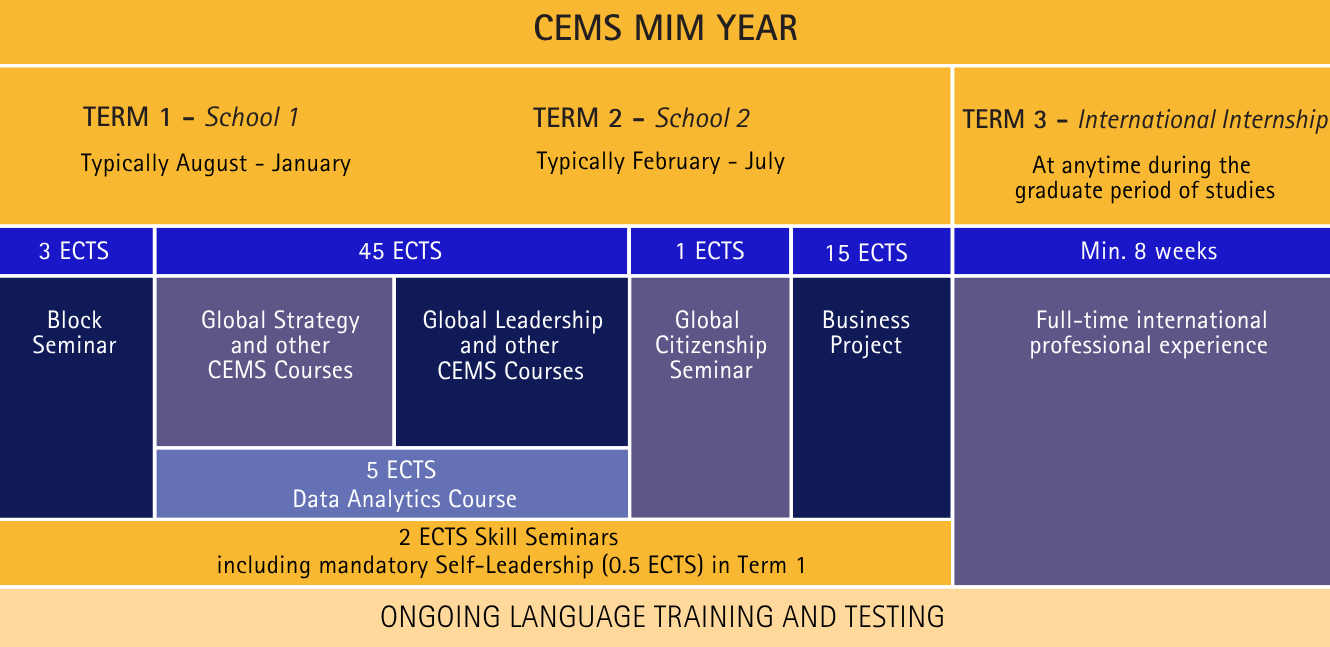 The total workload of the CEMS MIM curriculum is 66 ECTS. The minimum workload per term during the official CEMS year is 24 ECTS; courses, skill seminars, block seminars, and business projects included.