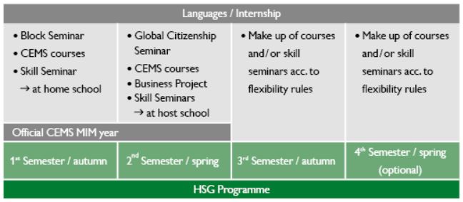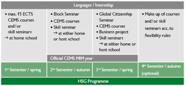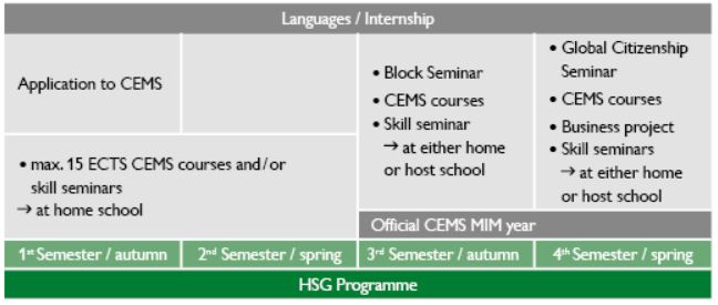 Some of the CEMS requirements will be credited towards the HSG Master's degree. Details can be found in the 'CEMS credit transfer rules and guidelines' which can be downloaded on studentweb.
