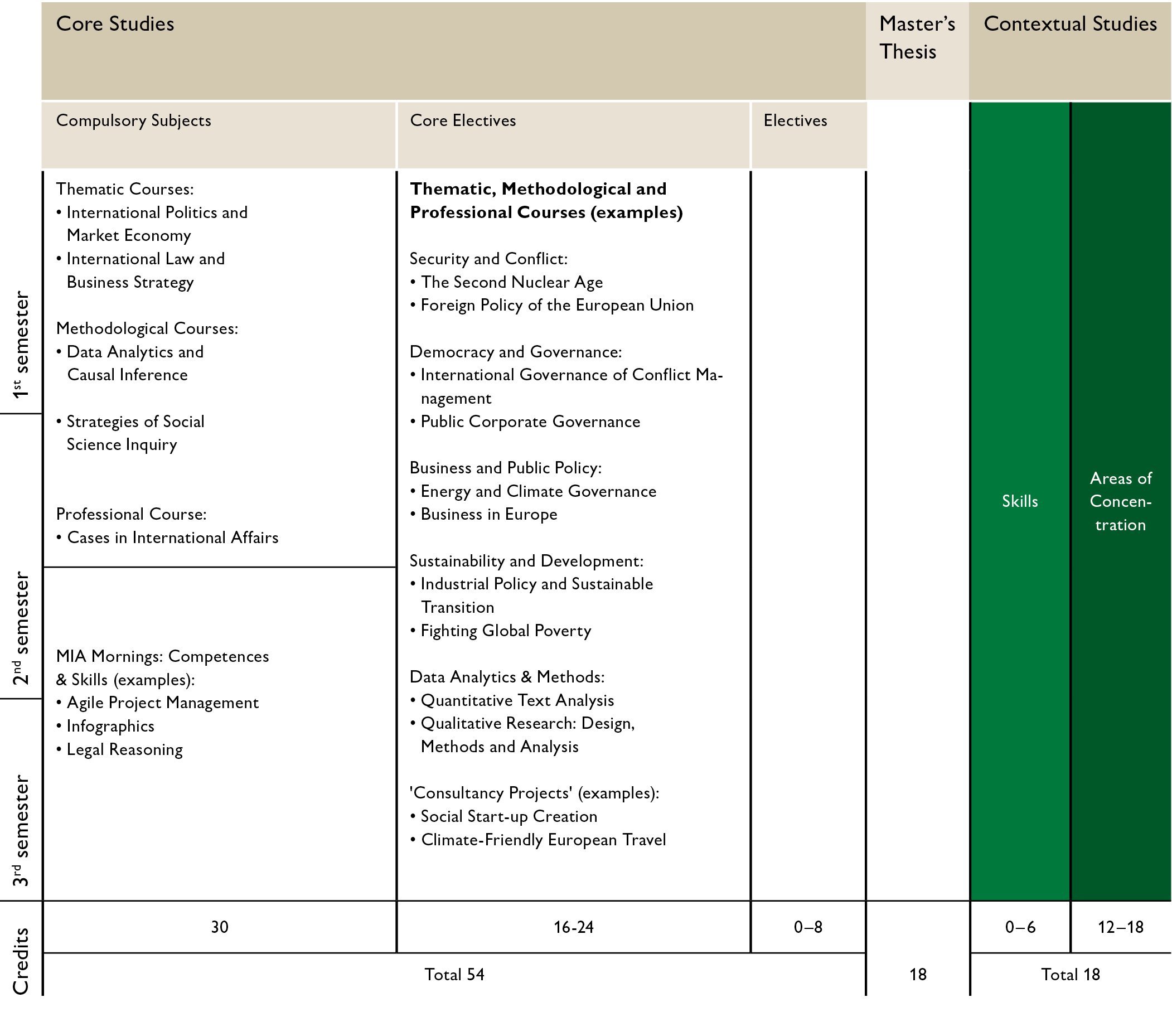 The MIA programme is structured along three pillars, i.e. thematic, methodological, and professional, and comprises six compulsory subjects, covering central concepts, issues, and skills in International Affairs.