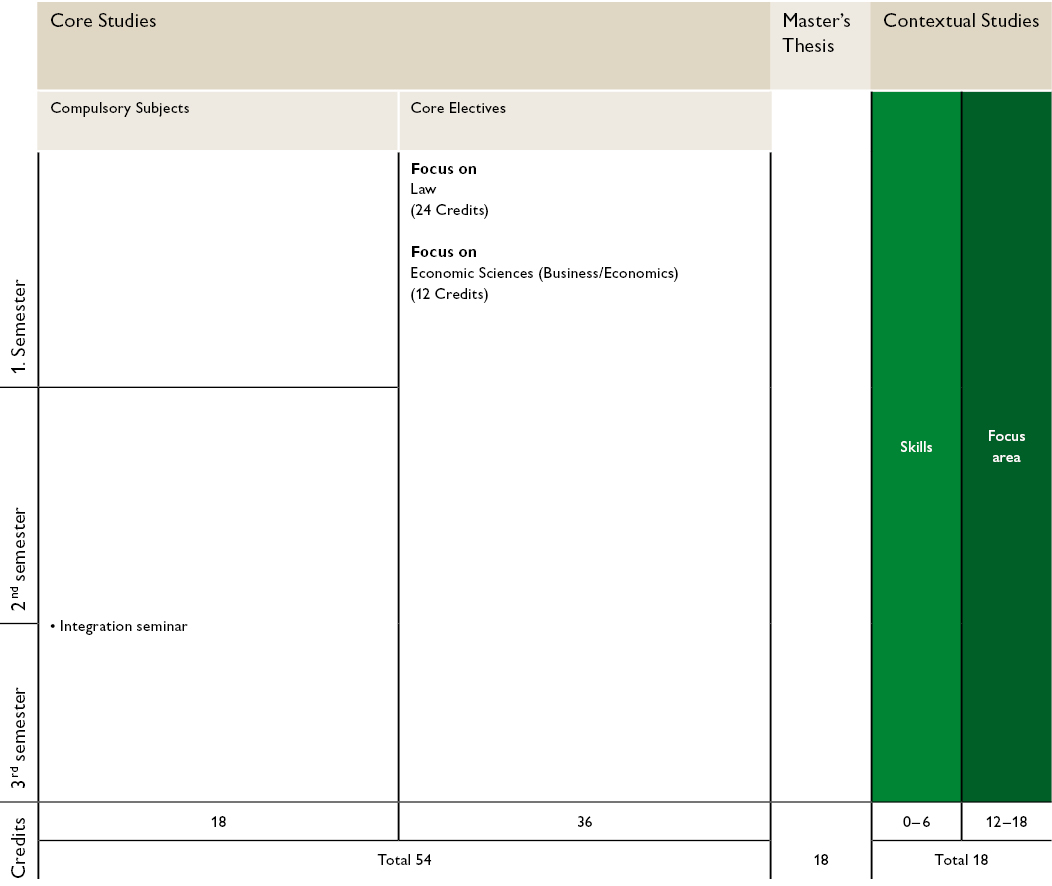 The MLE programme consists of 90 credits and is typically completed in three semesters. Legal studies form the core of the curriculum, accounting for approximately two-thirds of the course content, while the economic component makes up around one-third. The MLE courses are partially conducted in conjunction with other Master's programmes (particularly the Master's in Law) or are drawn from various economics programmes.