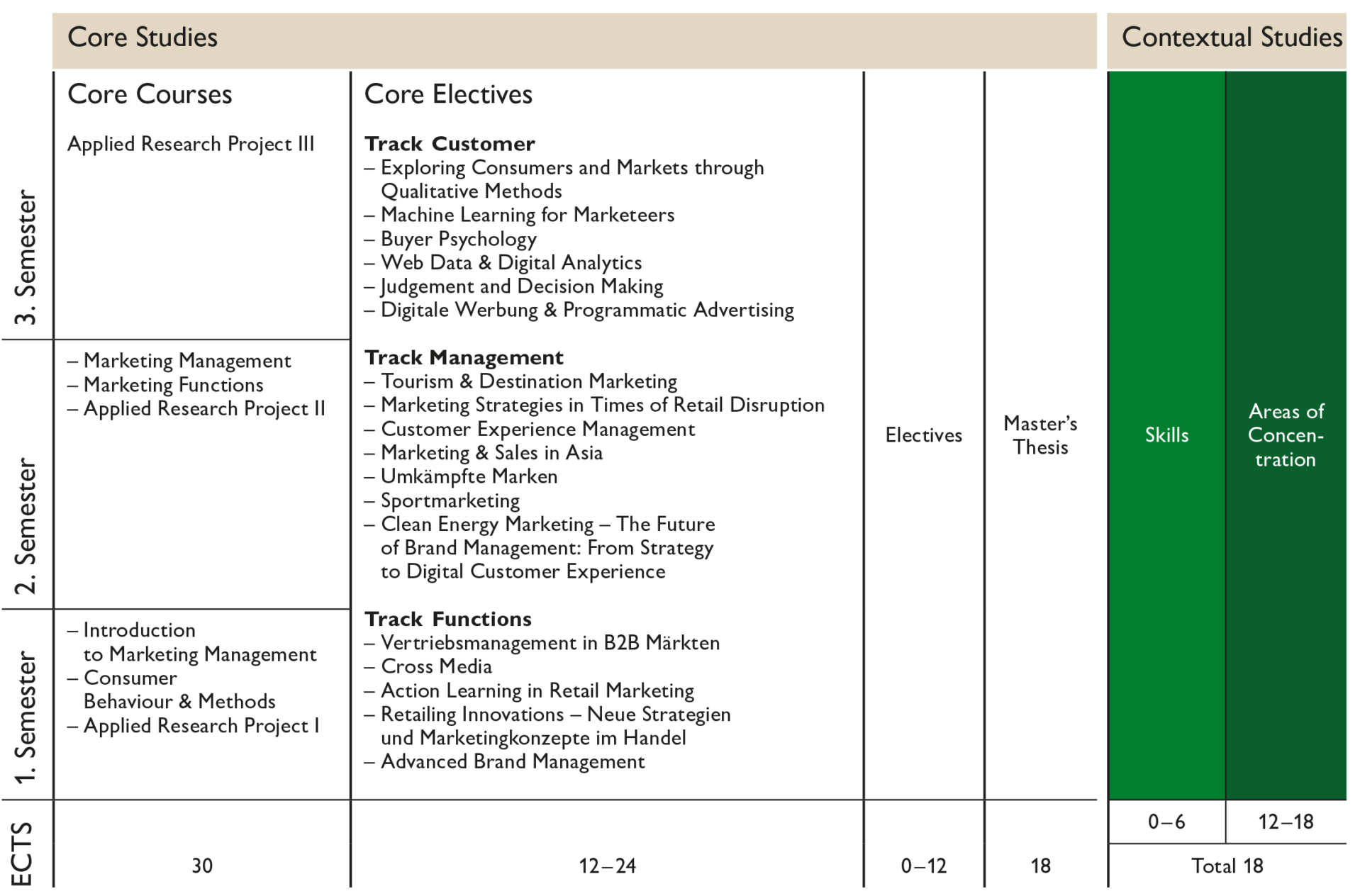 The MiMM programme is based on a three-track concept (customer / corporate management / function). The three compulsory courses in the fields of customers (Consumer Behaviour & Methods), corporate management (Marketing Management) and function (Marketing Functions) are preceded by a course of fundamentals (Introduction to Marketing Management) with an integrative study trip. Within the scope of the Applied Research Projects 1 – 3 (compulsory courses), you carry out a three-semester long practice project in close cooperation with businesses and supervised by a teaching staff member. Additionally, several core electives offer a selection of continuously renewed courses that supplement the three tracks and are dedicated to responsible and sustainable behavior in research and practice. These various commitments led to the MiMM being listed as one of the HSG’s sustainability programs.