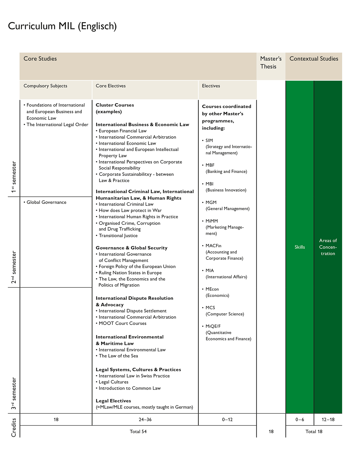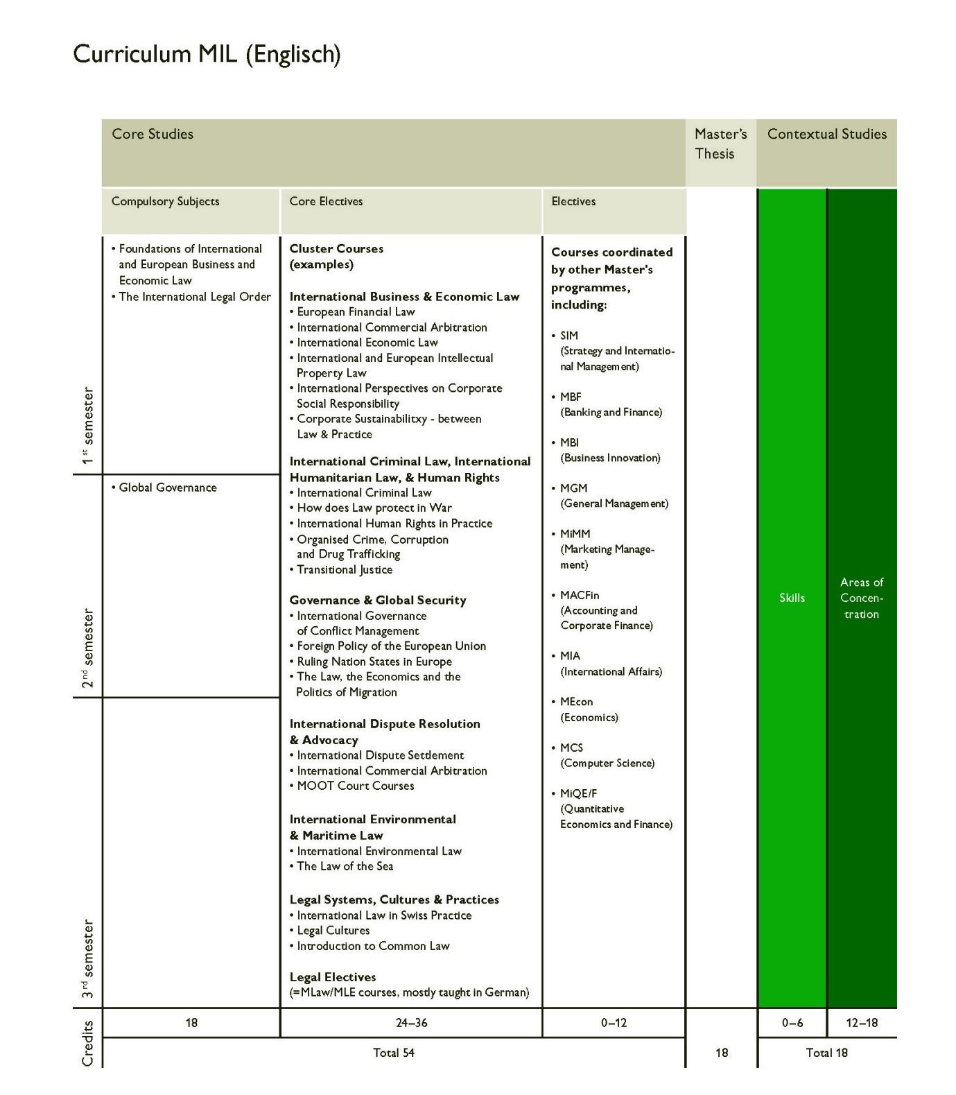 A distinctive feature of the MIL curriculum is the carefully arranged combination of mandatory courses and electives. Three mandatory courses ensure that students will acquire a sound general understanding of the normative and analytical framework of international law. At the same time, a rich offering of electives enables them to specialise in selected topics in law, management studies or political science.