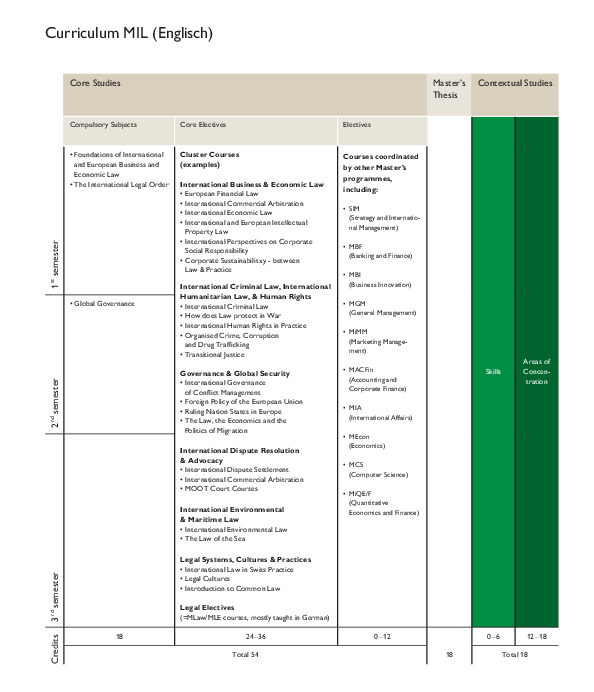 A distinctive feature of the MIL curriculum is a carefully arranged combination of mandatory courses and core electives. Three courses are mandatory for students to take: “The International Legal Order” and “Foundations of International and European Business and Economic Law” in fall term, and “Global Governance” in spring term. These three courses allow students to acquire a sound understanding of the normative and analytical framework of law and governance. Each of the courses is taught by an acclaimed teacher belonging to St. Gallen faculty, namely L. Grover, T. Burri und C. Frei.