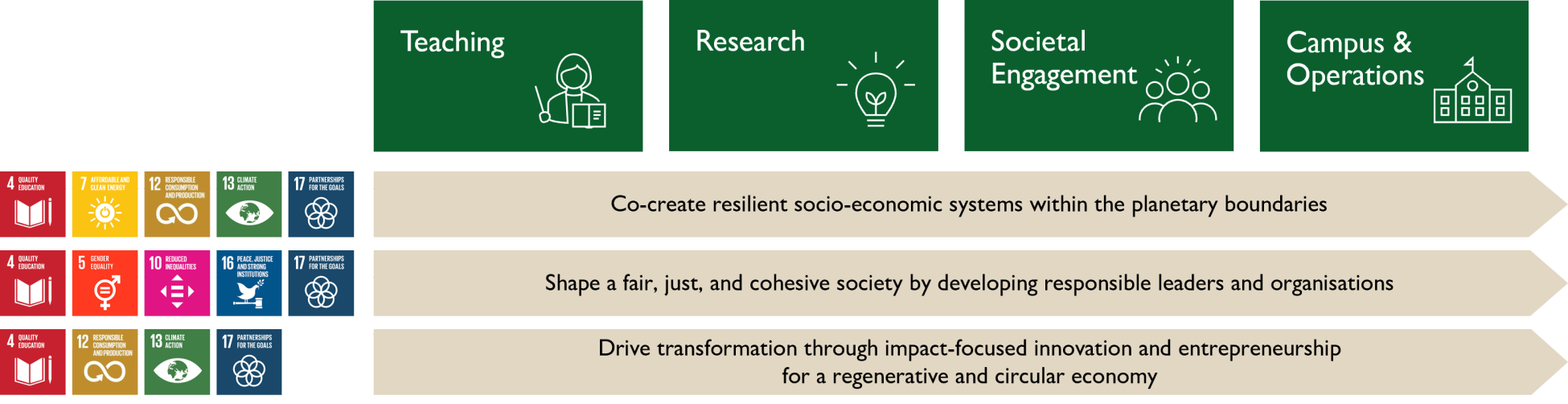 The HSG Strategic Plan deeply integrates sustainability in a broad sense across environmental, social, and economic dimensions. In doing so, HSG aims to embed sustainability in all its core areas of activity, namely teaching (all degree levels), research, societal engagement, as well as campus & operations. Our overarching goals are: