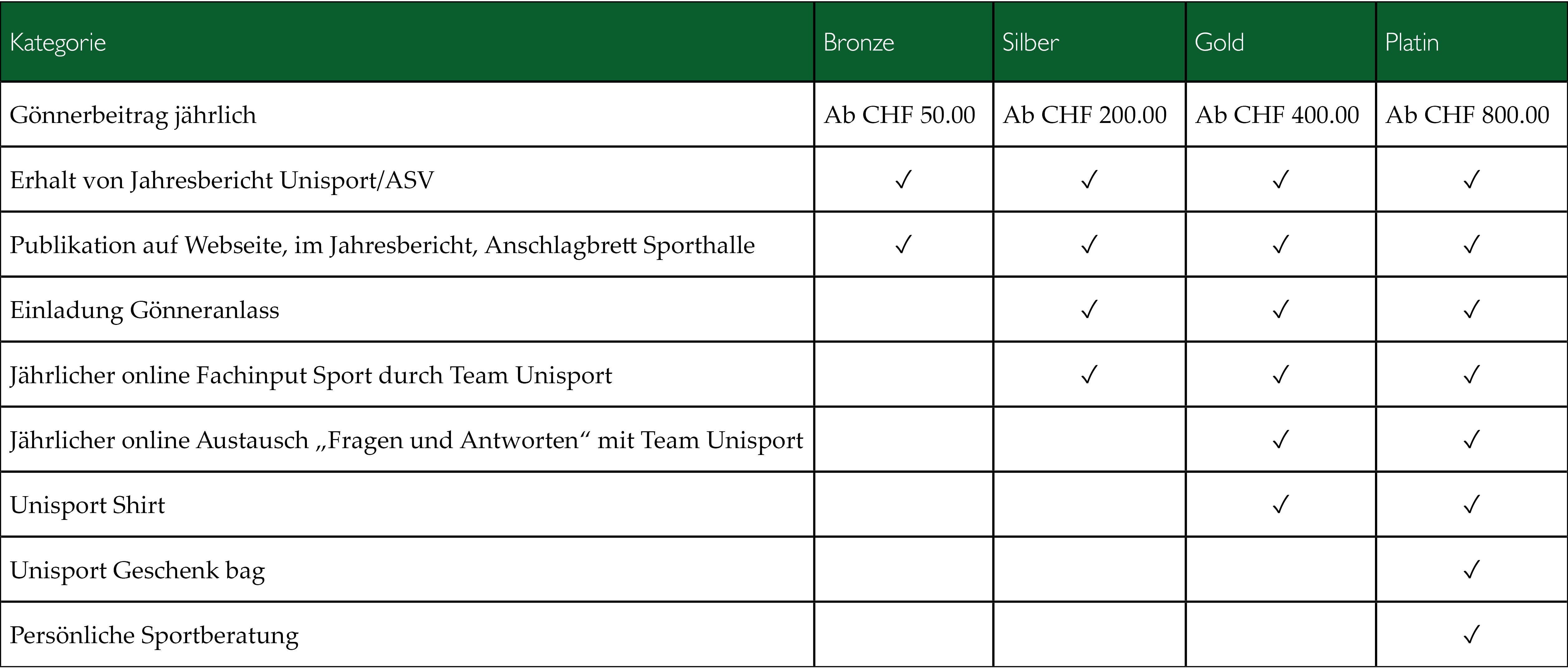 Private und juristische Personen können die Gönnerplattform nutzen und mithelfen bei der finanziellen Unterstützung des Unisports. Wir können versichern, dass die Gönnerbeträge sorgfältig und zielgerichtet verwendet werden.