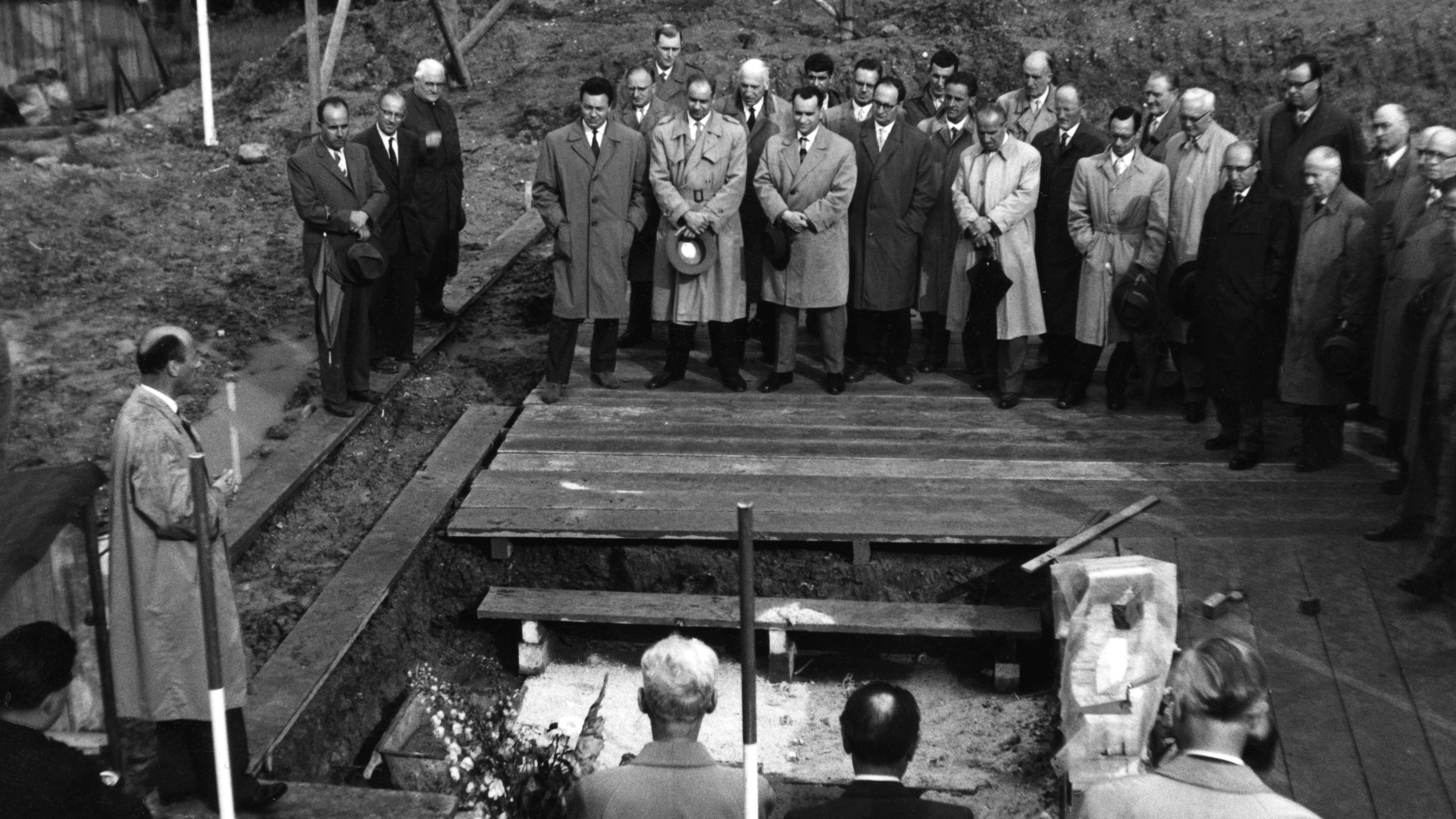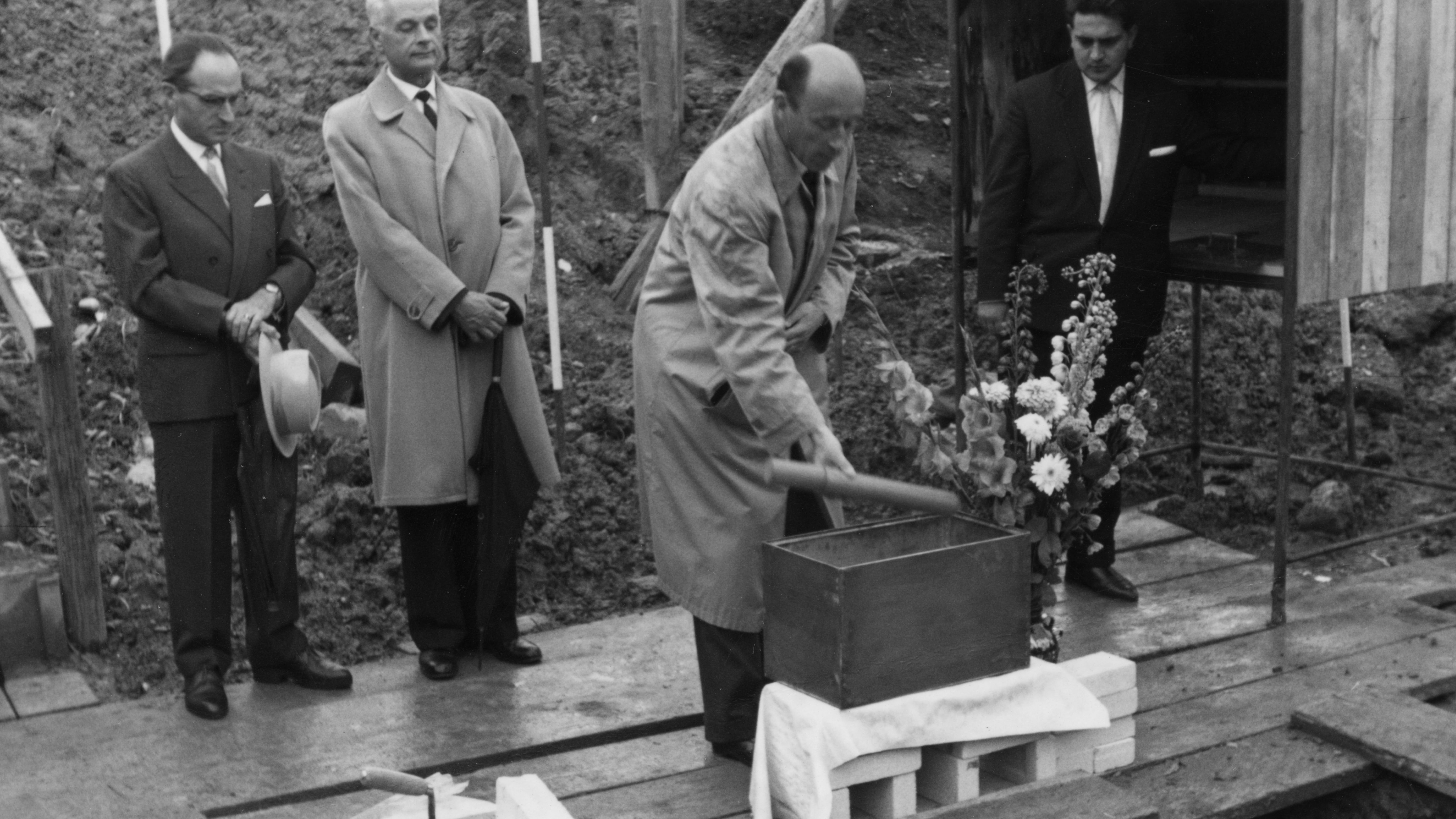 Es war nicht das freundlichste Wetter für einen feierlichen Anlass dieser Art: Regen fiel auf die Teilnehmenden nieder, die am Samstagnachmittag, dem 9. Juli 1960, zur Grundsteinlegung für das Institutsgebäude (Dufourstrasse 48) als erster Abschnitt des Neubaukomplexes auf dem Rosenberg zugegen waren – keine zwei Monate nach dem feierlichen Spatenstich anlässlich des Hochschultags (14. Mai 1960).