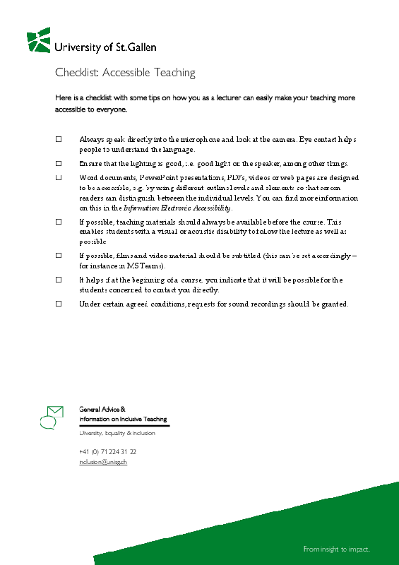 The Information Sheet on Electronic Accessibility also offers guidance on ensuring e-accessibility. If you wish to create barrier-free PDFs, we suggest using PAVE, a tool designed by the ICT Accessibility Lab at ZHAW School of Engineering. Training for accessible teaching is available on Canvas. See also the Teaching Innovation Lab’s blog post on accessible teaching.