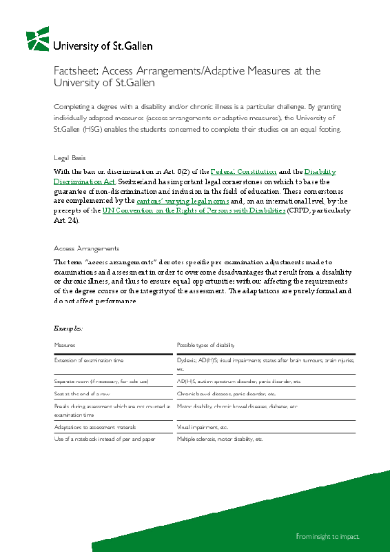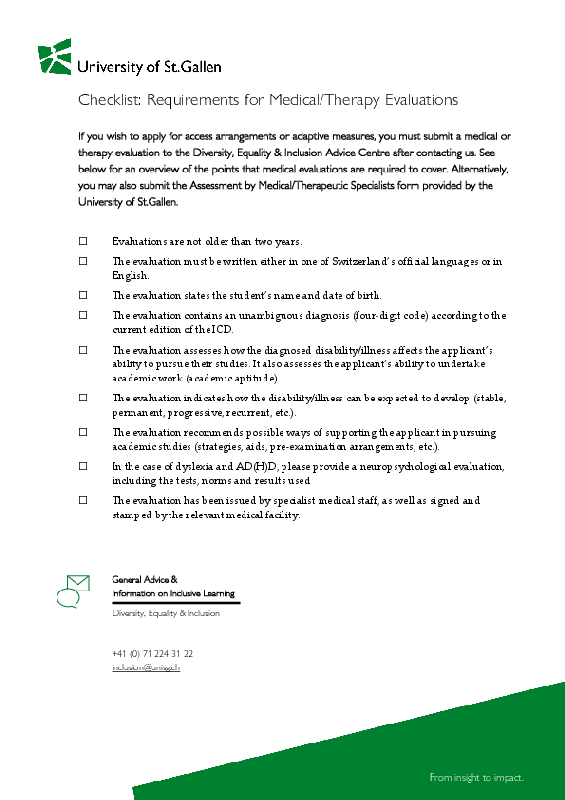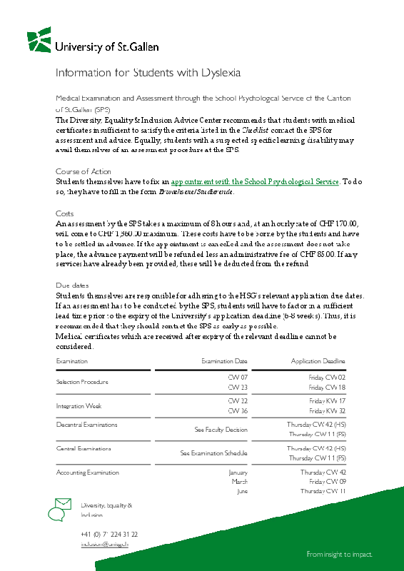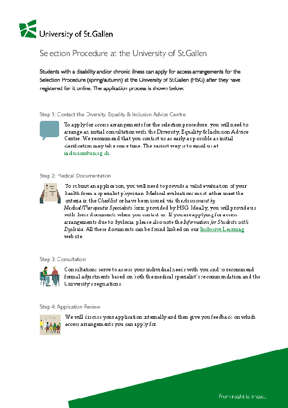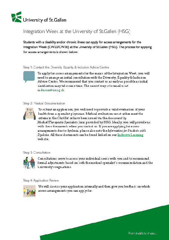 ![]() | To apply for access arrangements or adaptive measures, you will need to arrange an initial consultation with the Diversity, Equality & Inclusion Advice Centre. We recommend that you contact us as early as possible, as initial clarification may take some time. The easiest way is to email us at inclusion@unisg.ch. |