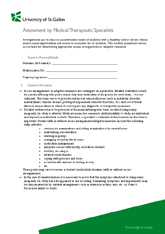 ![]() | To submit an application, you will need to provide a valid evaluation of your health from a specialist physician. Medical evaluations must either meet the criteria in the Checklist or have been issued via the Assessment by Medical/Therapeutic Specialistsprovided by HSG. Ideally, you will provide us with these documents when you first contact us, and at the latest by the time of the consultation. If you are applying for access arrangements due to dyslexia, please also note the Information for Students with Dyslexia. |