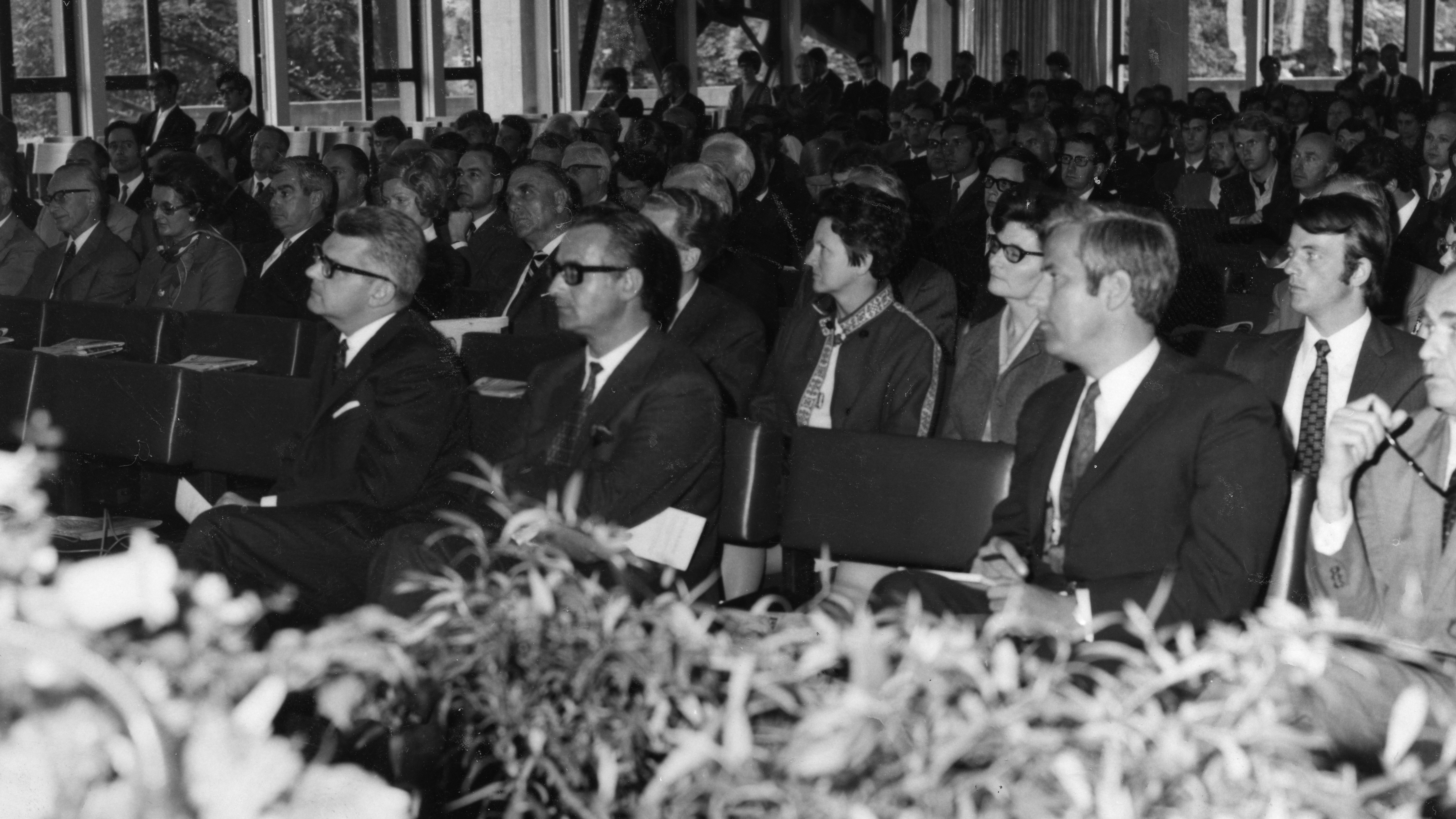 The wave of student protests of the ‘68 movement’ that ran through European cities remained almost unnoticed at HSG. In contrast and as an alternative to the chaos elsewhere, here at HSG the orientation was towards a consensus between decision-makers and the young generation that the way to shape the future should be sought in a dialogue. Thus, in 1969 five students from Switzerland, Austria, Germany, the Netherlands and Norway founded the International Students' Committee (ISC) which was supposed to facilitate an exchange between business representatives, researchers and students. On 30 June/1 July 1970 this committee organised the first symposium entitled ‘First International Managers Discussion at Hochschule St Gallen’, known today as St Gallen Symposium. Among the speakers were President Kneschaurek as well as top-class managers such as M.J.P. Dennis (General Director of INSEAD) and G.A. Wegner (Managing Director of the Royal Dutch Shell Group). The occasion was rounded off with a special concert in the newly built St Gallen Theater.