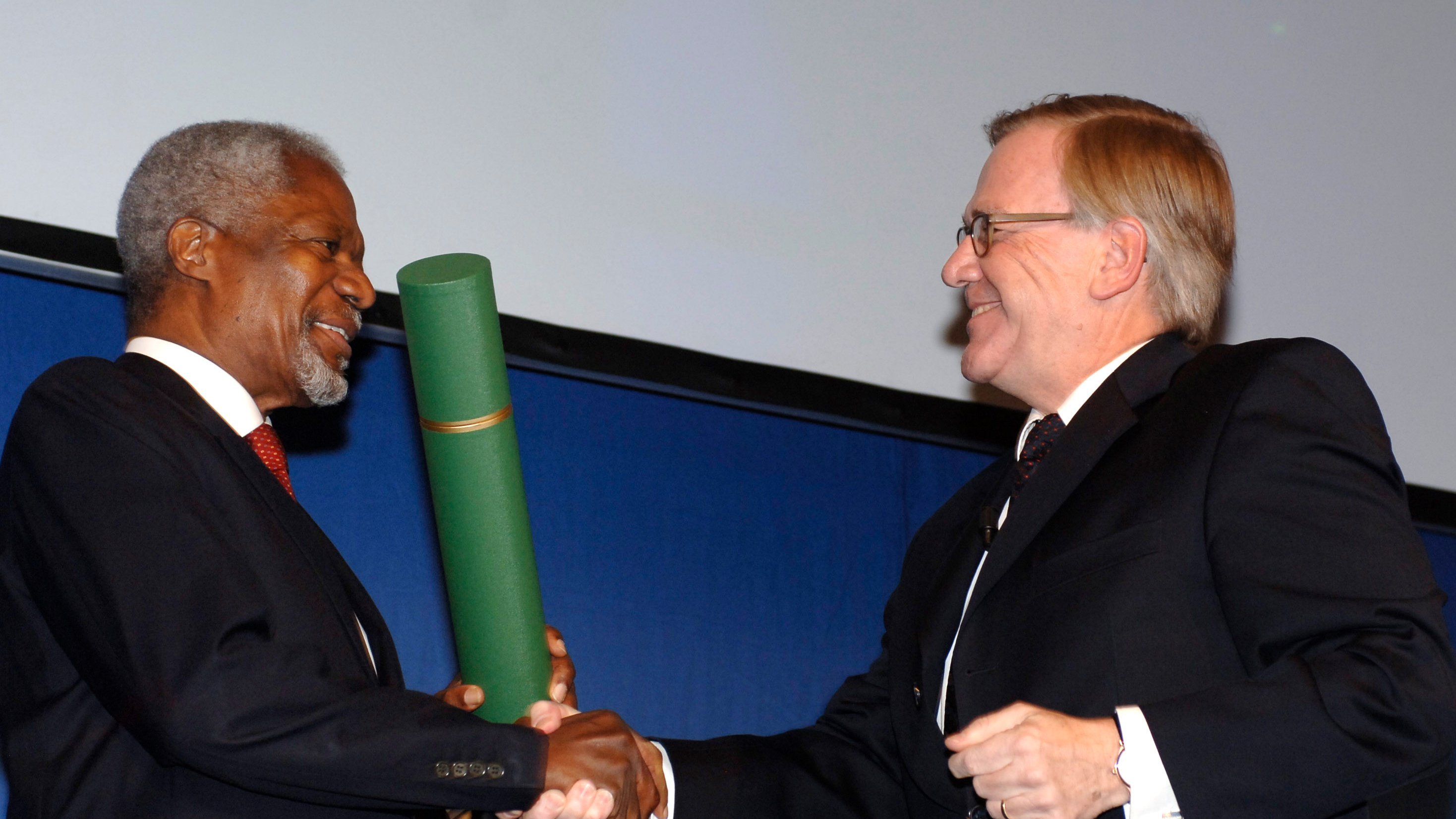 In its fifty-year long history, the St.Gallen Symposium has had some great moments, one of them being the discussion panel with the German President of the Employers Association Hanns Martin Schleyer and the DGB Chairman Heinz Oskar Vetter (1977). Remarkable speeches were delivered by Edouard Balladur, former French Finance Minister, Dr. Alfred Herrhausen, Chairman of the Board of Deutsche Bank, Dr Markus Lusser, President of the Swiss National Bank, Paul A. Volcker, former US Federal Reserve Chairman and Muhammad Yunus (2006 Nobel Peace Prize laureate). In November 2006, the then UN Secretary-General Kofi Annan was presented with the Max Schmidheiny Foundation Freedom Award (awarded in 2003). The 2003 award ended this tradition, which had continued since 1979.