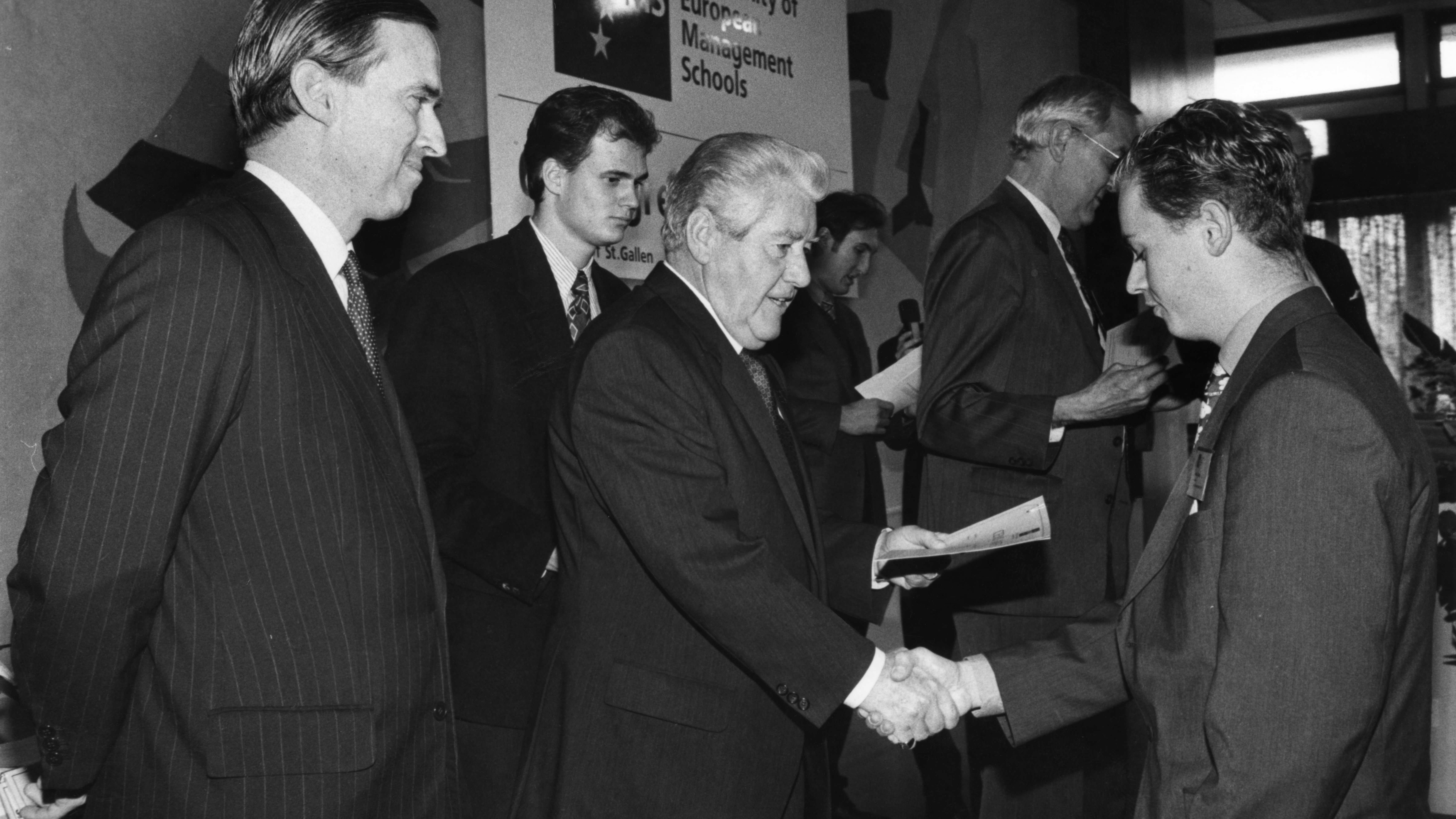 On 1 December 1990, HSG became a member of the Community of European Management Schools (CEMS). This membership has served not only to improve HSG's networking with the leading European business schools but also intended to support HSG students in their international mobility and to enable them to obtain an additional internationally recognised qualification. It was a special honour for HSG that the CEMS Graduation (6th CEMS degree ceremony) could take place here for the first time on 2 December 1995, thus almost exactly five years to the day after its accession. More than 250 graduates from all over Europe received their degree certificates at this major event, and at the same time, furthermore, the CEMS Executive Board appointed the HSG professor Heinz Hauser as CEMS chairman.