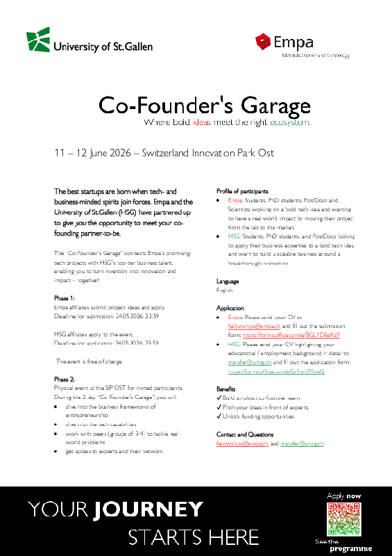 The best startups are born when tech- and business-minded spirits join forces. Empa and the University of St.Gallen (HSG) have partnered up to give you the opportunity to meet your co-founding partner-to-be. The “Co-Founder’s Garage” connects Empa’s promising tech projects with HSG’s top-tier business talent, enabling you to turn invention into innovation and impact – together!