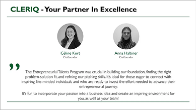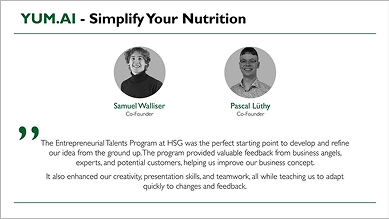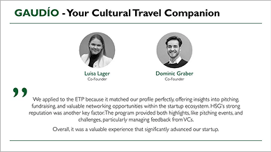 The HSG Entrepreneurial Talent Program encourages students from all academic levels to work on innovative projects, with HSG Entrepreneurship supporting them in transforming their ideas into impactful innovations. The program emphasizes validating the feasibility of future products or services, building solid entrepreneurial foundations, and providing continuous support and guidance, even after the funding period ends, through further financing, participation in advanced programs, or forming spin-offs and collaborations.