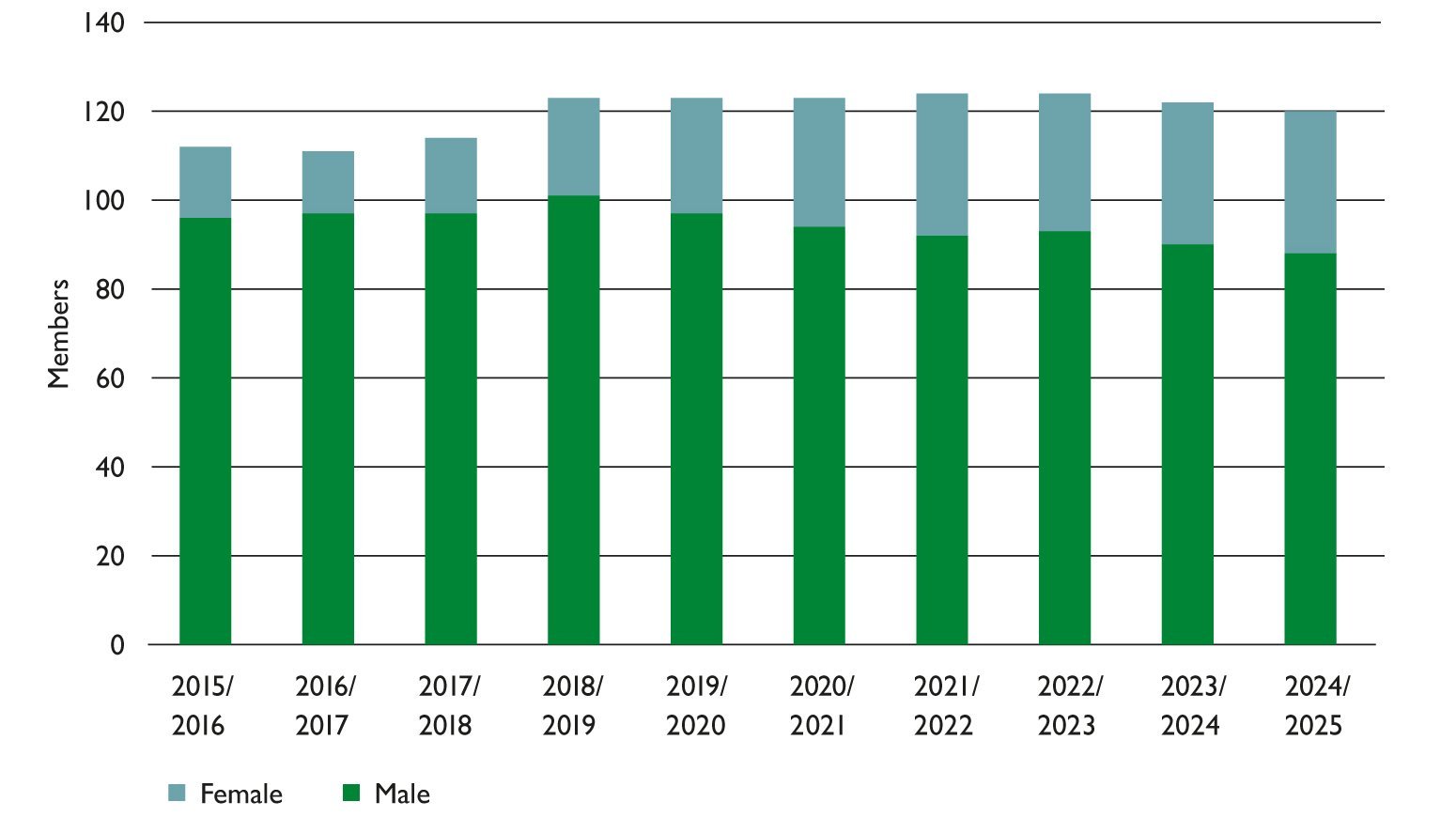 The Senate is the highest academic body of the University of St.Gallen. The proportion of women among voting members has increased from 24% in the 2020/21 academic year to 27% in the 2024/25 academic year.