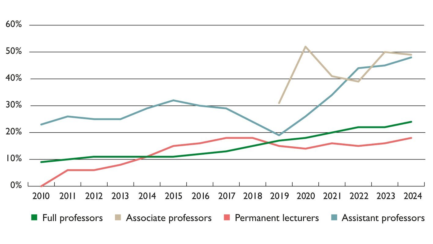 The proportion of female faculty members has increased from 24% to 33% since 2021 (full professorships, associate professorships, assistant professorships, and permanent lectureships). In 2023/2024, two-thirds of newly appointed full professors and the newly appointed associate professor were female.