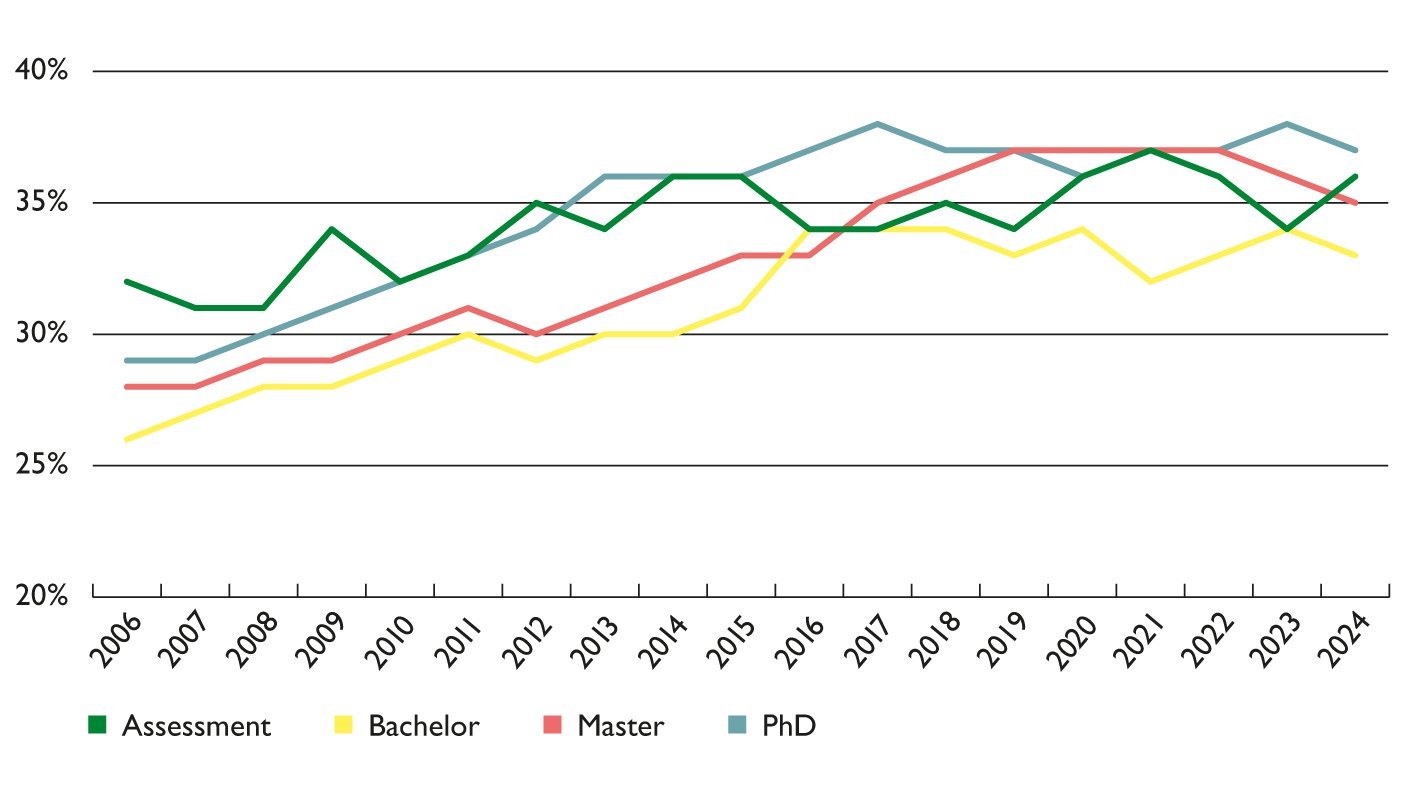 In 2024, 35% of all students at the HSG were female. This proportion remained constant compared to the last report in 2021.