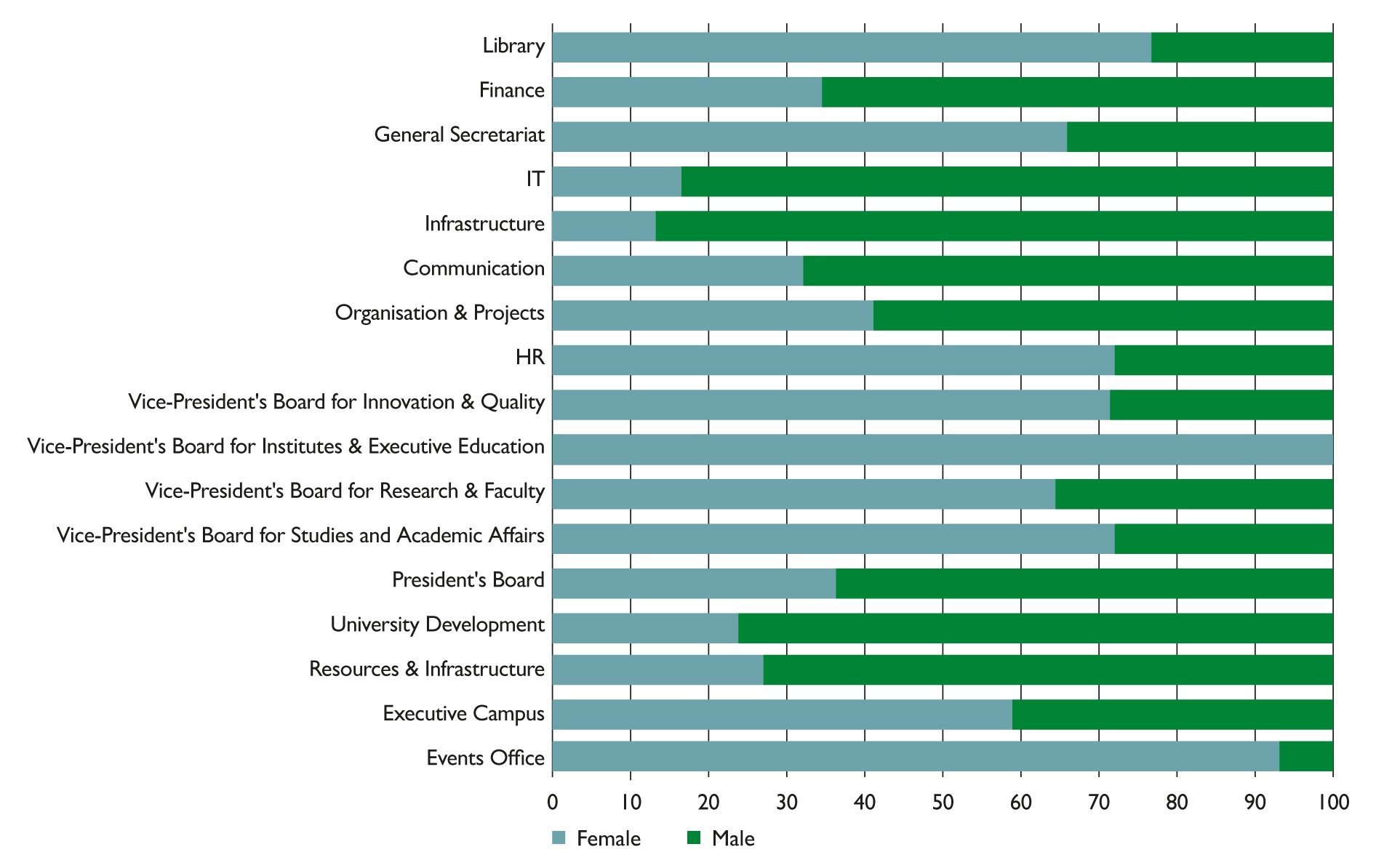 At the end of 2024, women accounted for approximately 51% of the workforce in HSG Services. This calculation is based on full-time equivalents and includes employees on monthly and hourly salaries as well as external consultants. The gender distribution in the individual organisational units is shown in the graph below.