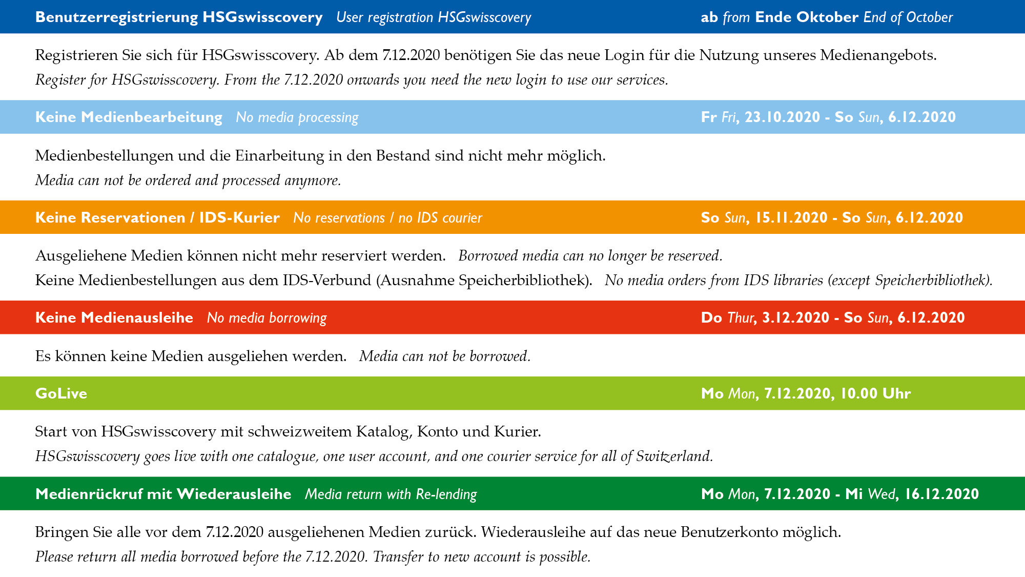 03.12.2020 The automatic extension of the loan period is ending due to the imminent library system change to HSGswisscovery. Borrowing media in the new system at HSG library will be possible from the 07.12.2020 on. |