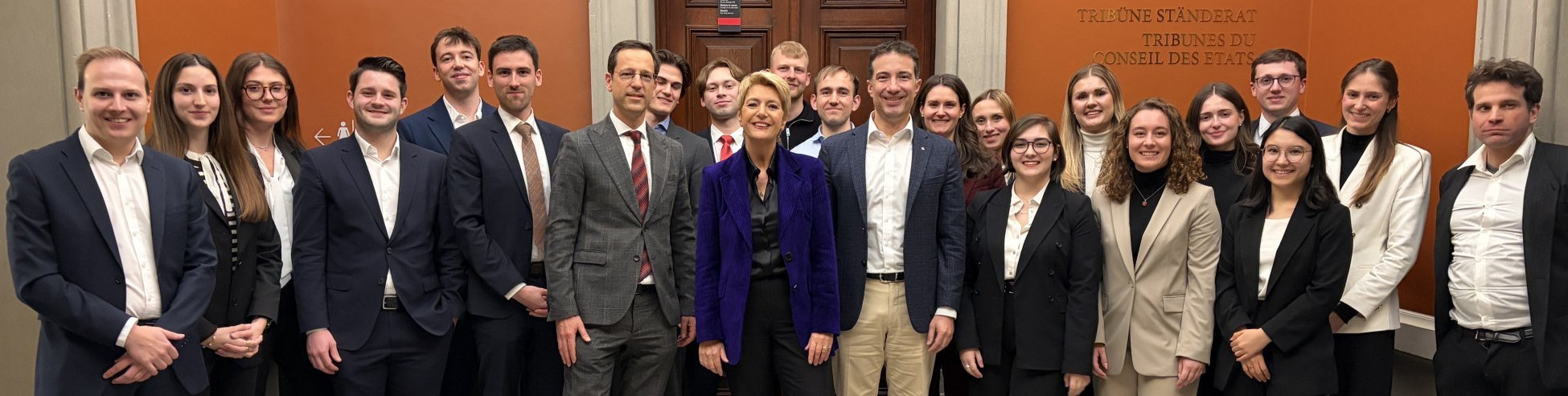 President of the Council of States Andrea Caroni, Honorary Professor at the University of St. Gallen, and Stefan G. Schmid once again led the popular and challenging master's course “HSG im Bundeshaus – Rechtsetzung in der Praxis” this spring semester. After each student had drafted a bill and committee report on the implementation of a pending parliamentary initiative (“Parliamentary Participation Rights in Foreign Policy”), they traveled to Bern to simulate the parliamentary process on site. At the same time, they had the unique opportunity to exchange ideas with numerous top representatives of federal politics and administration, including President of the Swiss Council of States Stefan Engler, National Councillor Aline Trede (leader of the Green parliamentary group in the Federal Assembly), Federal Councillor Karin Keller-Sutter (Head of the Federal Department of Finance), Federal Chancellor Viktor Rossi, Michael Schöll (Director of the Federal Office of Justice), Ruth Lüthi (Deputy Secretary of the Political Institutions Committee) and Florent Tripet Cordier (Secretary of the Foreign Policy Committees).