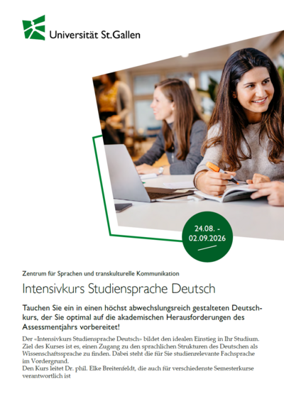The course is aimed at foreign-language students enrolled in the German track of the Assessment Year who would like to enhance their German skills before beginning their studies at the University of St.Gallen.