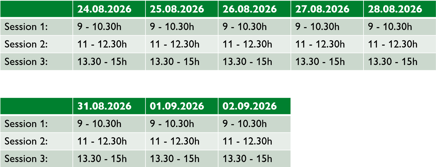 This intensive course is an 8-day course comprising 48 lessons. The course is taught by experienced intensive course teachers Carolyn Skelton, MA, MSc and Dr. phil. Paul Skandera.