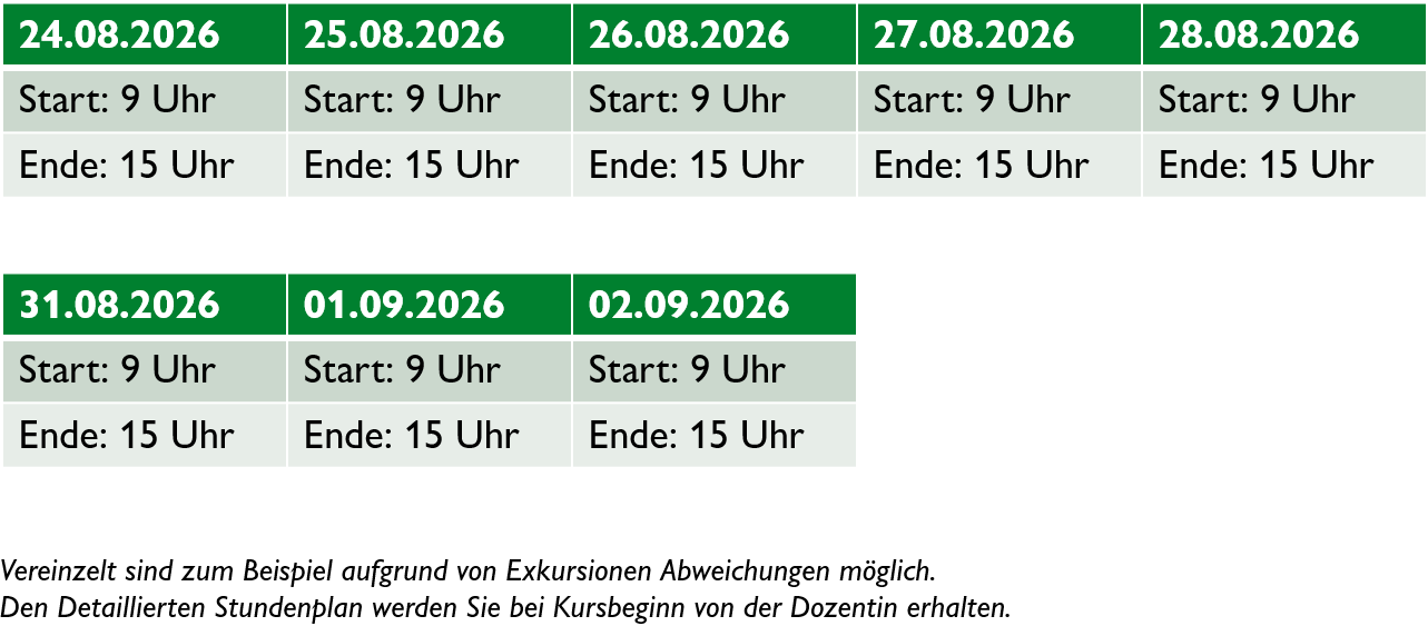 The intensive course is an 8-day course comprising 48 lessons. It is taucht by Dr. phil. Elke Breitenfeldt, who has many years of experience in teaching this course.